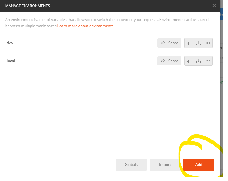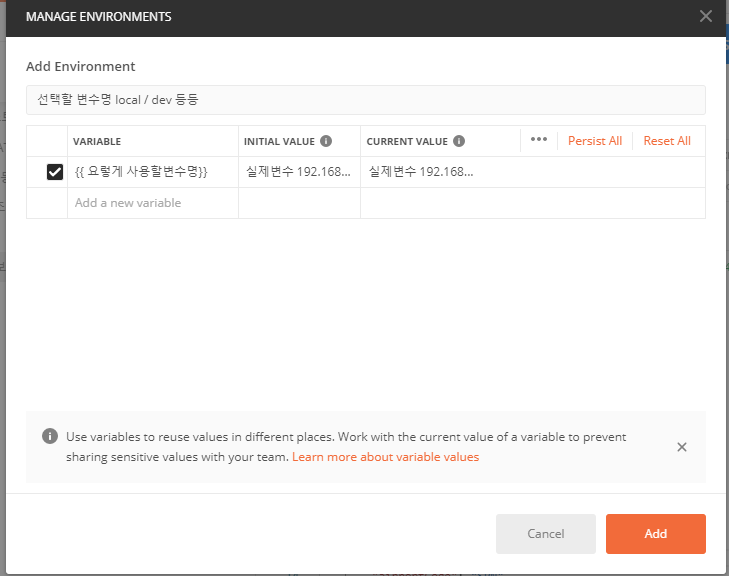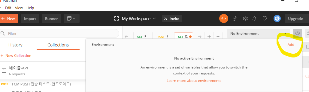 오른쪽 상단 No env... 옆 버튼을 누르면