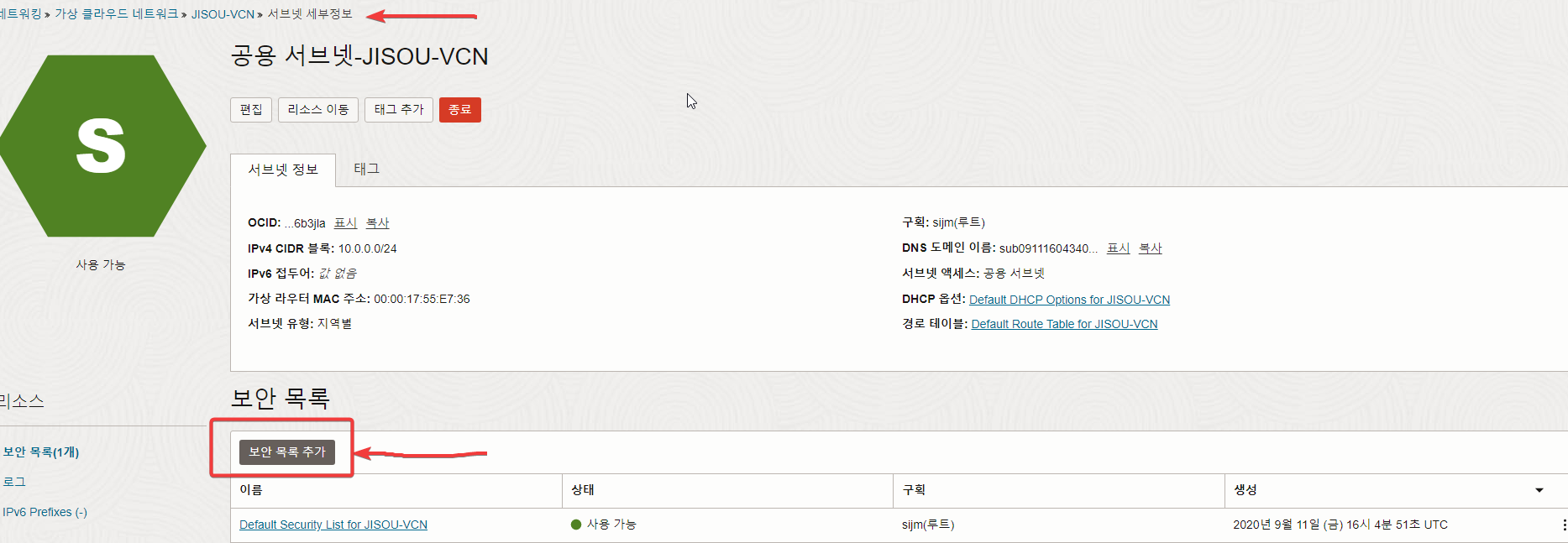 공용 서브넷 클릭 하여 HTTPS 등 보안 설정을 열어준다