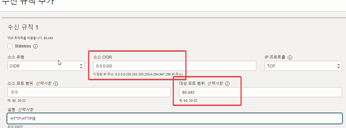 대상 포트( Destination Port ) Range: 오픈할 포트 번호 목록